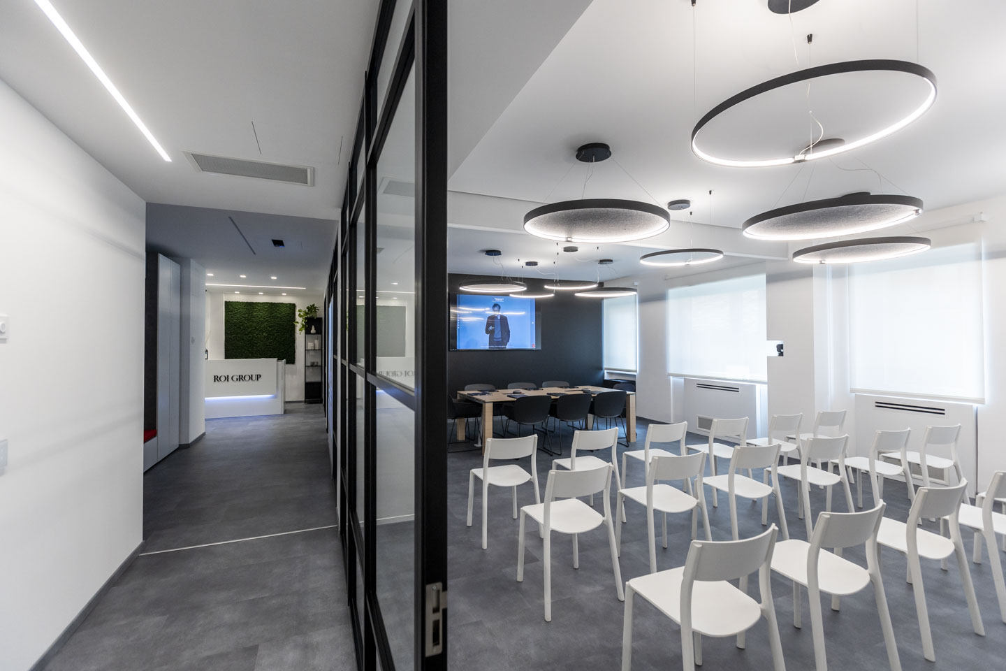Il controllo della privacy, della luce solare e della fruizione degli spazi avviene tramite sistemi di tende a rullo motorizzate realizzate da Cioverchia. L’impiantistica è totalmente integrata nel progetto con soluzioni incassate su misura e cablaggi delle postazioni studiati ad hoc, si ringrazia la consulenza Tecnica di Michele Grioli degli Impianti Tecnici Speciali Rema Tarlazzi Comet SpA. Si è riusciti a coniugare eleganza e funzionalità grazie alla Domotica Vimar per la gestione dell’illuminazione e della climatizzazione Daikin. Controllo Accessi e controllo sala Meeting con Exertis leader del settore Audio Video professionale. Nell’area d’attesa si è studiato un pannello, integrato nella parete che conduce alla sala riunioni, su cui con un videoproiettore incassato a soffitto si raccontano i contenuti dell’azienda. I dettagli grafici e segnaletici vanno ad integrarsi personalizzando elementi d’arredo, sempre accompagnati da un mirato studio illuminotecnico. La massima attenzione è stata data al benessere individuale unitamente alla volontà di trasmettere lo spirito aziendale anche tramite l’architettura dei ROIGROUP headquarters.